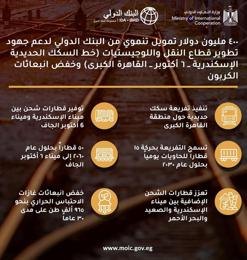 أعلنت مجموعة البنك الدولي، موافقة مجلس المديرين التنفيذيين للبنك، على تمويل تنموي بقيمة 400 مليون دولار، لتطوير البنية التحتية المستدامة بقطاع النقل، وتعزيز آداء وتعزيز أداء قطاعي الخدمات اللوجستية والنقل في مصر، ودعم التحول نحو النقل منخفض الانبعاثات الكربونية على خط السكك الحديدية الإسكندرية ــ 6 أكتوبر ــ القاهرة الكبرى.