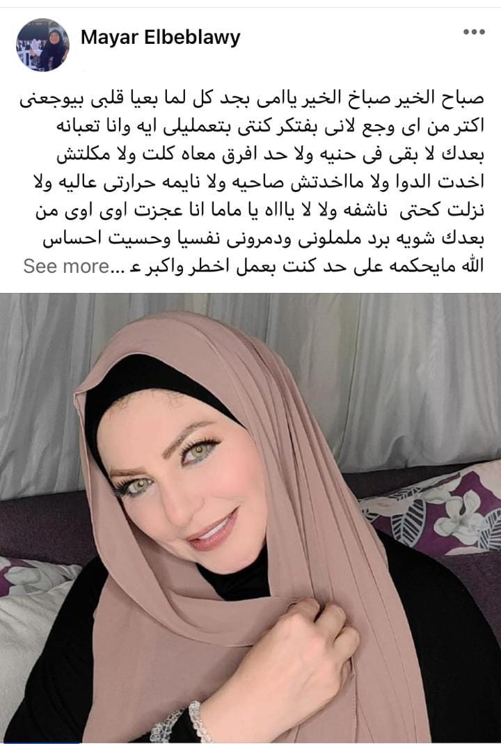 وكتبت ميار الببلاوي عبر فيسبوك: يا أمي.. بجد كل لما بعيا قلبي بيوجعني أكتر من أي وجع لأني بفتكر كنتي بتعمليلي إيه وأنا تعبانة، بعدك لا بقى فيه حنية ولا حد أفرق معاه كلت ولا مكلتش أخدت الدوا ولا ما أخدتش صاحية ولا نايمة، حرارتي عالية ولا نزلت، كحتي ناشفة ولا لا.
