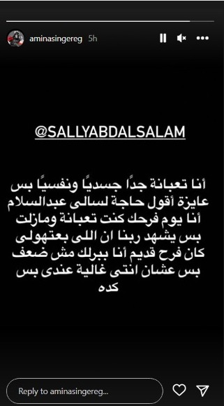 ونشرت أمينة ستوري عبر حسابها الرسمي بموقع تبادل الصور والفيديوهات الشهير انستجرام، قالت فيه: “أنا تعبانة جدًا جسديًا ونفسيًا بس عايزة أقول حاجة لسالي عبدالسلام أنا يوم فرحك كنت تعبانة.