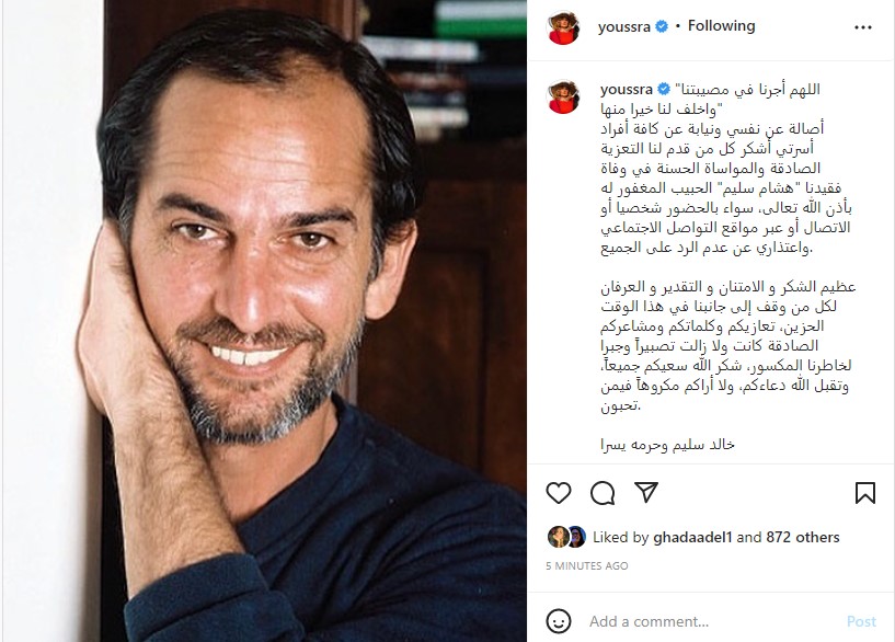 وجهت الفنانة يسرا رسالة شكر لرسائل التعازي وجميع من ساندهم في تلك المحنة بعد وفاة الفنان هشام سليم شقيق زوجها.