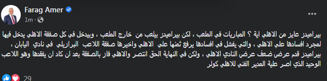 وكتب فرج عامر عبر حسابة الشخصي"في بوك:" بيراميدز عايز من الأهلي اي ؟ المباريات في الملعب ، لكن بيراميدز بيلعب من خارج الملعب ، وبيدخل في كل صفقة القلعة الحمراء يدخل فيها لمجرد افسادها عليه.