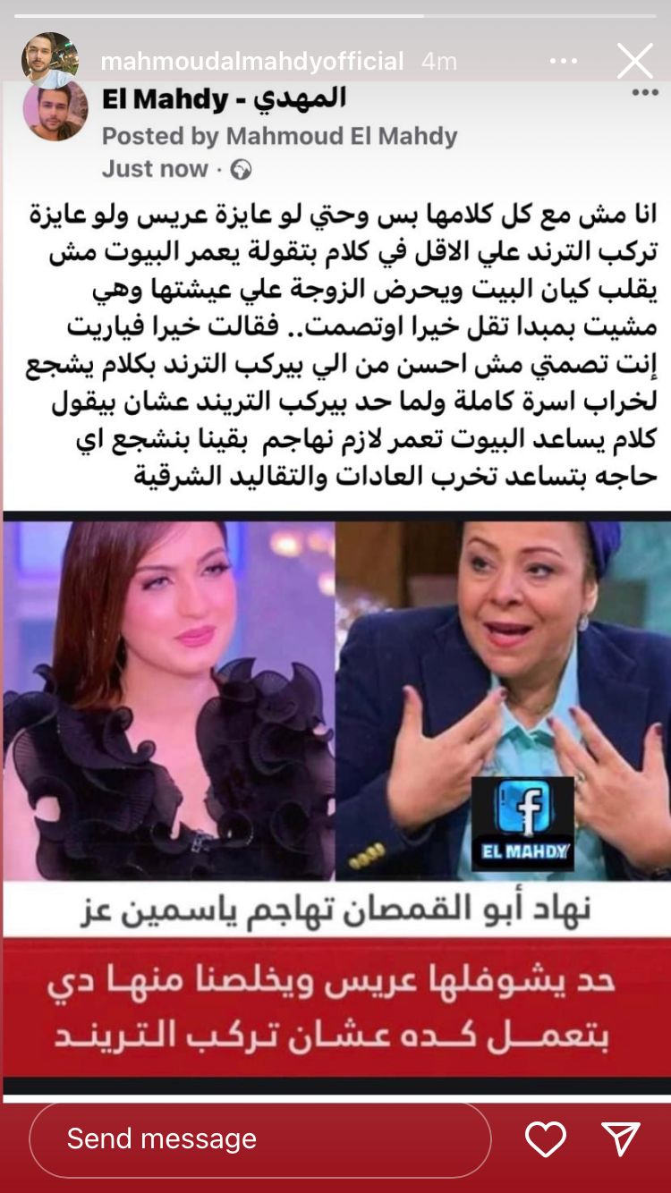 وكتب محمود المهدي داعمًا للإعلامية ياسمين عز: أنا مش مع كل كلامها بس وحتي لو عايزة عريس ولو عايزة تركب الترند علي الأقل في كلام بتقولة يعمر البيوت مش يقلب كيان البيت ويحرض الزوجة علي عيشتها.