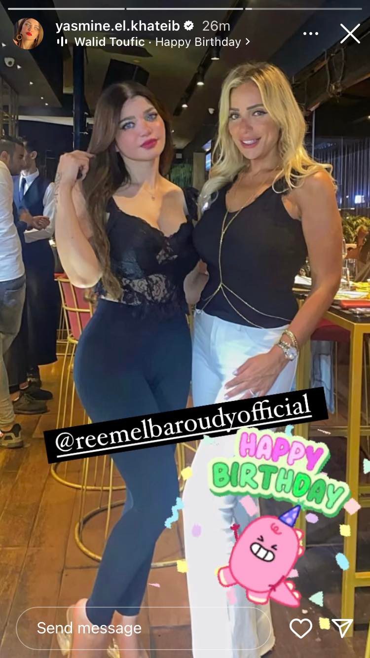 ونشرت ياسمين الخطيب صورة لها برفقة ريم البارودي عبر خاصية ستوري، بحسابها الرسمي بانستجرام، وعلقت: “كل سنة وأنتي طيبة” على أنغام أغنية “انزل يا جميل في الساحة”.
