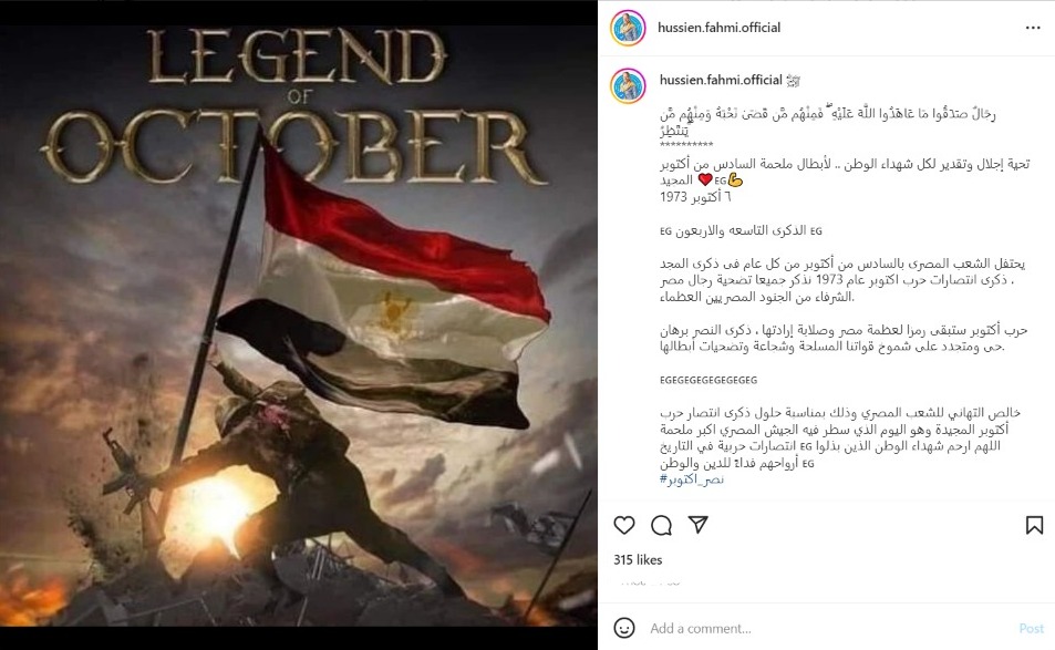 ونشر حسين فهمي صورة لجندي بعلم مصر، وعلق: رجال صدقوا ما عاهدوا الله عليه فمنهم من قضى نحبه ومنهم من ينتظر تحية إجلال وتقدير لكل شهداء الوطن.. لأبطال ملحمة السادس من أكتوبر المجيد ٦ أكتوبر 1973 الذكرى التاسعة والأربعين.
