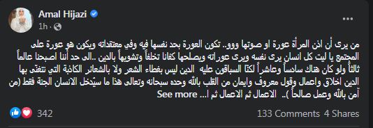 وكتبت أمل حجازي عبر فيسبوك: من يرى أن اذن المرأة عورة أوصوتها ووو.. تكون العورة بحد نفسها فيه وفي معتقداته ويكون هو عورة على المجتمع.