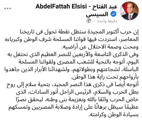 وكتب الرئيس السيسي على صفحته الشخصية على فيس بوك: «إن حرب أكتوبر المجيدة ستظل نقطة تحول في تاريخنا المعاصر، استردت فيها قواتنا المسلحة شرف الوطن وكبرياءه ومحت وصمة الاحتلال عن أراضيه».