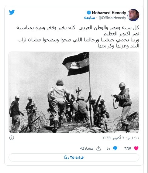 وكتب محمد هنيدي عبر تويتر: كل سنة ومصر والوطن العربي كله بخير وفخر وعزة بمناسبة نصر اكتوبر العظيم وربنا يحمي جيشنا ورجالتنا اللي ضحوا وبيضحوا عشان تراب البلد وعزتها وكرامتها.