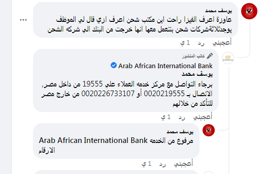 رد موظف خدمة عملاء البنك العربى الافريقى على الصفحة قائلاً: "برجاء التواصل مع مركز خدمه العملاء علي 19555 من داخل مصر، الاتصال بـ 0020219555 أو 0020226733107 من خارج مصر للتأكد من خلالهم".
