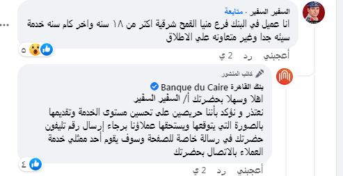 قال أحد عملاء بنك القاهرة عبر صفحة المصرف على موقع: "فيسبوك"، : "أنا عميل في البنك فرع منيا القمح شرقية أكثر من ١٨ سنة وآخر كام سنة خدمة سيئه جدا وغير متعاونة على الاطلاق".
