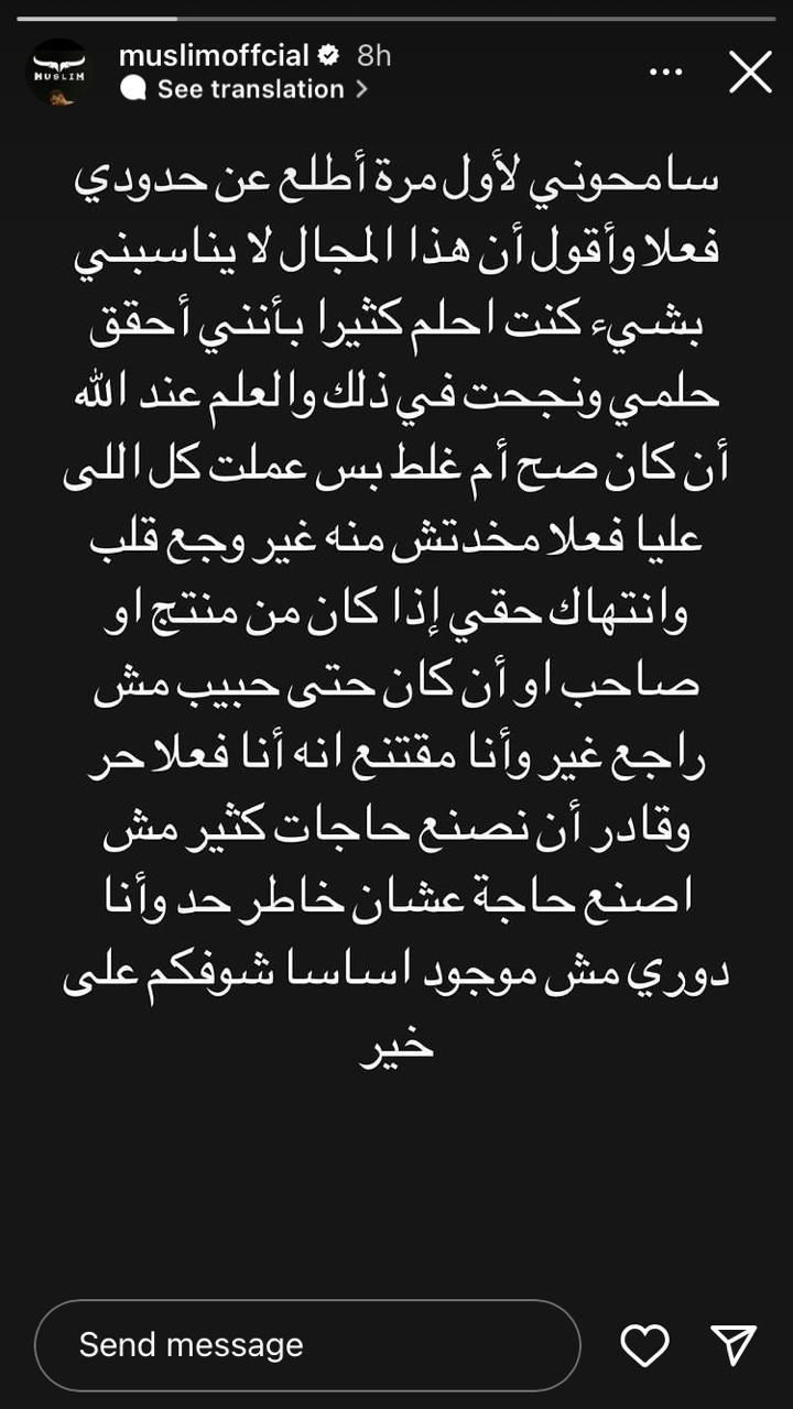 وكتب مسلم في الاستوري عبر انستجرام: سامحونى لأول مرة أطلع عن حدودى فعلا وأقول إن هذا المجال لا يناسبنى بشيء.. كنت أحلم كثيرا بأننى أحقق حلمى ونجحت فى ذلك والعلم عند الله إن كان صح أم غلط.