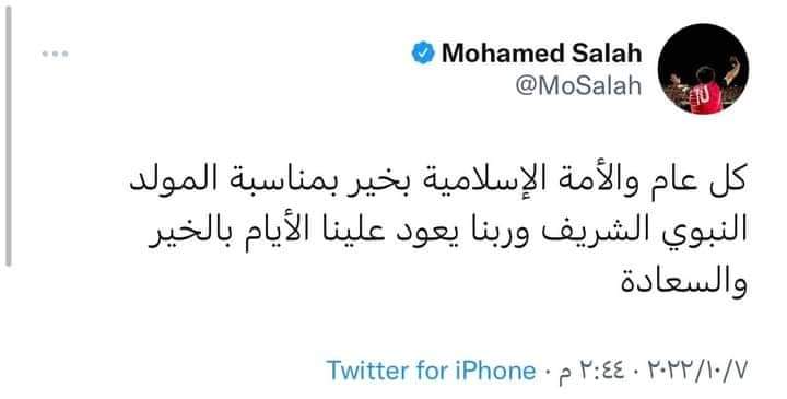 ونشر محمد صلاح تغريدة عبر حسابه الرسمي بموقع التواصل الاجتماعي "تويتر"، وعلق عليها قائلاً: "كل عام والأمة الإسلامية بخير بمناسبة المولد النبوي الشريف وربنا يعود علينا الأيام بالخير والسعادة ".