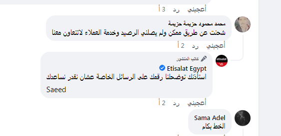 وقال أحد عملاء اتصالات مصر في تعليق على صفحة الشركة الرسمية على موقع "فيسبوك"،: "شحنت عن طريق ممكن ولم يصلني الرصيد وخدمة العملاء لاتتعاون معنا".