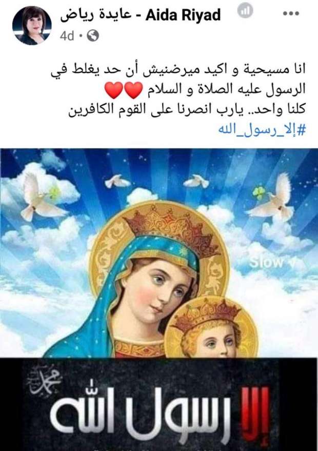 قبل سنتين، نشر حساب على موقع التواصل الإجتماعي فيسبوك باسم الفنانة عايدة رياض، منشورًا كان محتواه: “أنا مسيحية وأكيد مايرضنيش أن حد يغلط في الرسول عليه الصلاة والسلام كلنا واحد”.
