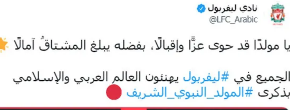 ونشر ليفربول تغريدة عبر حسابه الرسمي بموقع التواصل الاجتماعي "تويتر"، وعلق عليها قائلاً: "يا مولدا قد حوى عزا وإقبالا ، بفضله يبلغ المشتاق آمالاً ، الجميع في ليفربول يهنئون العالم العربي والإسلامي بذكرى المولد النبوي الشريف".