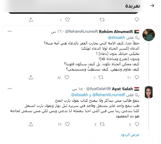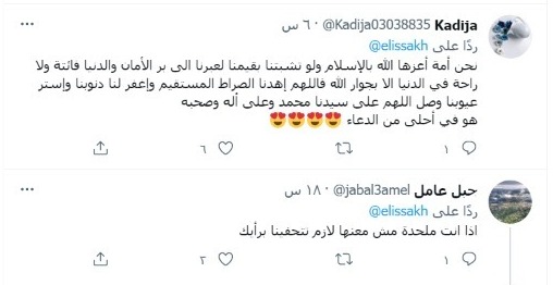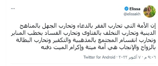 حيث كتبت إليسا عبر تويتر: إن الأمة التي تحارب الفقر بالدعاء وتحارب الجهل بالمناهج الدينية وتحارب التخلف بالفتاوي وتحارب الفساد بخطب المنابر وتحارب انقسام المجتمع بالمذهبية والتكفير وتحارب البطالة بالزواج والإنجاب هي أمة ميتة وإكرام الميت دفنه.