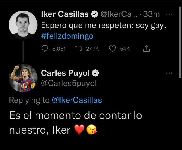 وعلق كارلوس بويول زميله سابقًا في المنتخب الإسباني على تغريدته قائلًا: "حان الوقت لنخبر الجميع بقصتنا يا إيكر".