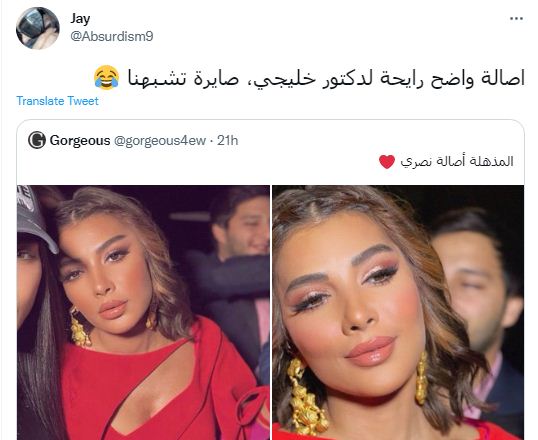 وسخرت فتاة خليجية من النجمة السورية أصالة، وقالت أنه من الواضح أنها ذهبت إلى طبيب خليجي جعلها تُشبهها، وقالت: “أصالة واضح رايحة لدكتور خليجي، صايرة تشبهنا”.