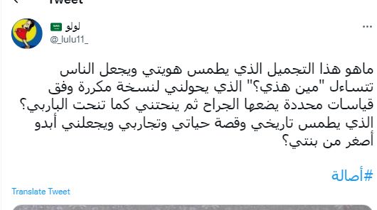 وقامت سيدة سعودية بمهاجمة أصالة، وقالت: “ماهو هذا التجميل الذي يطمس هويتي ويجعل الناس تتساءل مين هذي، الذي يحولني لنسخة مكررة وفق قياسات محددة يضعها الجراح ثم ينحتني كما تنحت الباربي”.