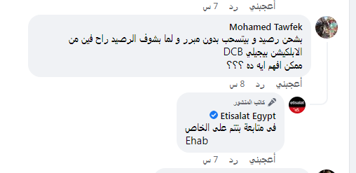 وقال عميل اتصالات مصر عبر صفحة الشركة الرسمية على موقع "فيسبوك"،: "بشحن رصيد وبيتسحب بدون مبرر ولما بشوف الرصيد راح فين من الابلكيشن بيجيلي DCB".