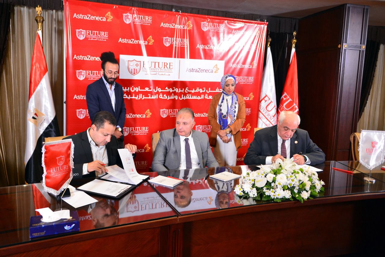 وقع الاتفاقیة عن جامعة المستقبل الدكتور عبادة سرحان، رئیس جامعة المستقبل وعن شركة أسترازینیكا الدكتورمحمد أمین، عضو مجلس الإدارة للشؤون الحكومیة ودعم الاسواق بشركة أسترازینیكا مصربالإنابة عن الدكتور حاتم الورداني رئیس مجلس إدارة شركة أسترازینیكا مصر والدكتور لؤي حسام، مدیر الانتاج والتصنیع وعضو مجلس الادارة بمصنع