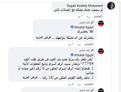 قال أحد عملاء اتصالات مصر عبر صفحة الشركة على موقع "فيسبوك"،: "لو سمحت عندى مشكلة مع اتصالات كاش".