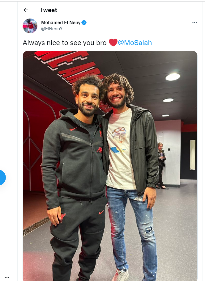 قام محمد النني، لاعب فريق أرسنال الإنجليزي، بمشاركة صورة مع النجم الدولي محمد صلاح، المحترف لدى صفوف ليفربول الإنجليزي، بعد انتهاء المباراة التي جمعت فريقهما على ملعب الإمارات، ضمن منافسات الجولة العاشرة من بطولة الدوري الإنجليزي 2022 – 2023.