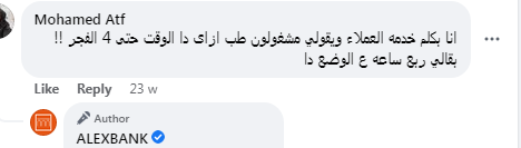 قال أحد عملاء بنك الاسكندرية عبر صفحة المصرف الرسمية على موقع "فيسبوك"،: "أنا بكلم خدمة العملاء ويقولي مشغولون طب ازاى دا الوقت حتى 4 الفجر !! بقالي ربع ساعة على الوضع دا".