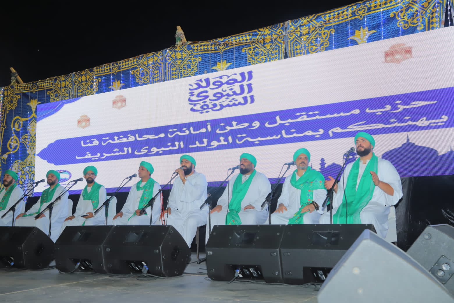 وقدمت فرقة "الحضرة " في الجزء الأول من إحتفالية الحزب الكبري بإستاد قنا الرياضي، مجموعة من أجمل ما أنشد في حب رسول الله وأهل بيته الكرام، وأحيي الجزء الثاني المنشد الديني الكبير محمود ياسين التهامي، من تلك الإحتفالية الكبري التي يحضرها الآلاف من أبناء محافظة قنا.