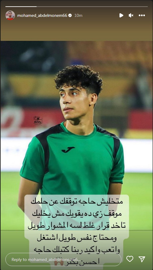 ومن ناحيه اخري، قد نشر اللاعب" أمس الإثنين، عبر مواقع التواصل الإجتماعي موضح الأمر وكتب:" قال لاعب المقاصة عبر حسابه على فيسبوك: "فاضل ساعات علي القيد وانا مخلصتش في اي مكان بعد ما مضيت في فرقتين مصري واسماعيلي وكنت بتعامل مع كل الناس بثقه كبيره جداً مضيت للمصري وفضلت منتظرهم يدفعو شيكات النادي ويخلصوني أنا مضيت للمصري قبل كابتن ايهاب ما يمسك الفرقه اول حاجه قولتها لوكيلي بعد كابتن ايهاب ما بقي المدير الفني قولتلو انا مستعد اتنازل عن أي حاجة بس اروح مع كابتن ايهاب اي حد يعرفني يعرف اني بحب كابتن ايهاب جلال جدا جدا وان كابتن ايهاب اكتر واحد ساعدني في حياتي".