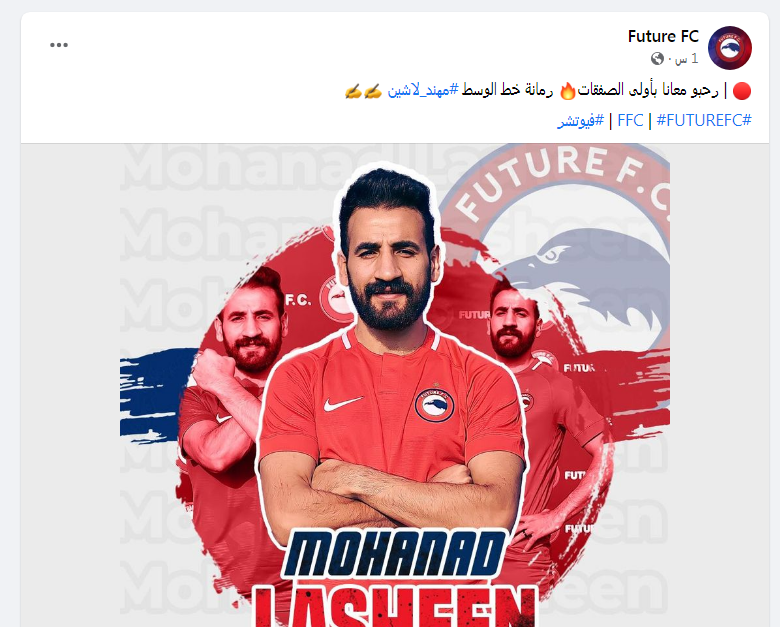 وكتبت الصفحة الرسمية لفريق فيوتشر على موقع التواصل الاجتماعي “فيس بوك” : “رحبو معانا بأولى الصفقات رمانة خط الوسط مهند لاشين ”.