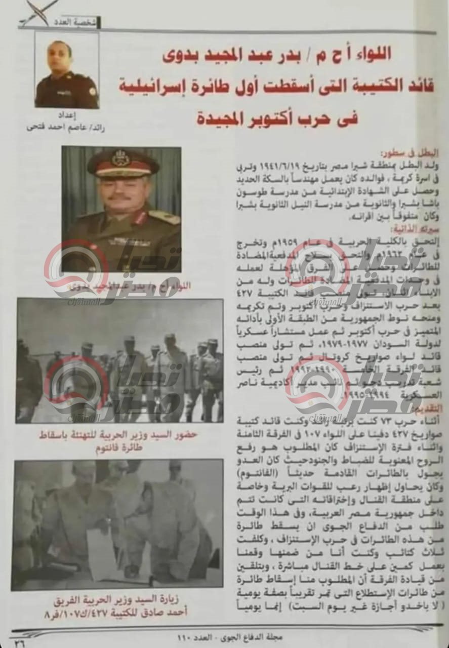 اللواء أركان حرب بدر عبد المجيد بدوى، قائد الكتيبة التى أسقطت أول طائرة إسرائيلية فى حرب أكتوبر الميجدة، وولد بمنطقة شبرا مصر بتاريخ 19 يونيو 1941 ووالده كان يعمل مهندسا بالسكه الحديد وحصل على الشهادة الإبتدائية من مدرسة طوسون باشا بشبرا والثانوية من مدرسة النيل الثانوية بشبرا وكان متفوقا بين أقرانه.