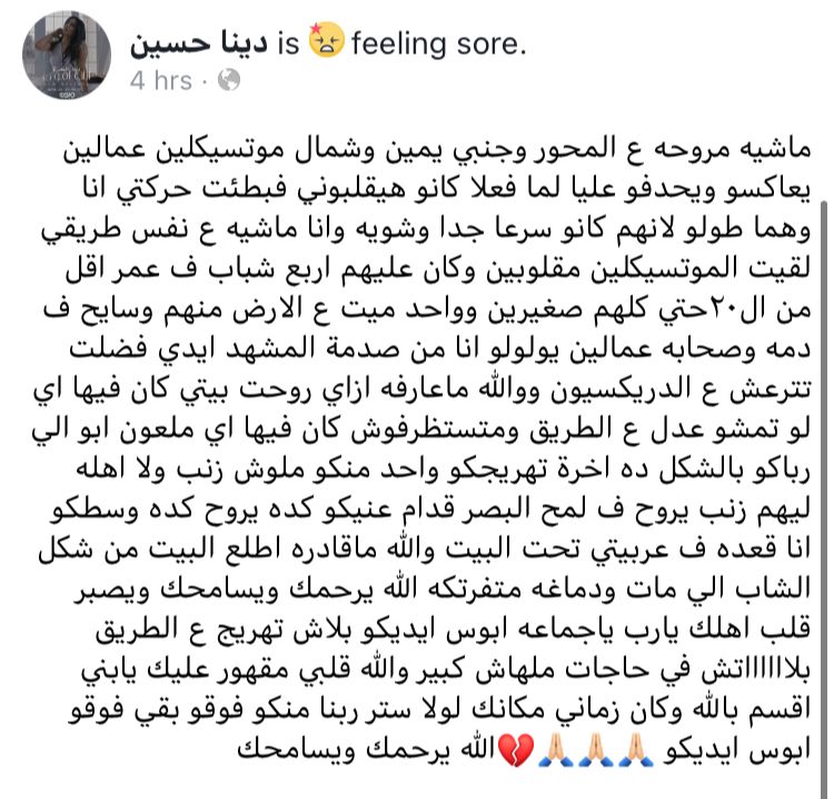 وتابعت دينا المصري: وشويه وأنا ماشية على نفس طريقي لقيت الموتسيكلين مقلوبين وكان عليهم أربع شباب ف عمر أقل من الـ٢٠حتي كلهم صغيرين وواحد ميت على الأرض منهم وسايح ف دمه وصحابه عمالين يولولو أنا من صدمة المشهد ايدي فضلت تترعش ع الدريكسيون ووالله ماعارفه ازاي روحت بيتي.