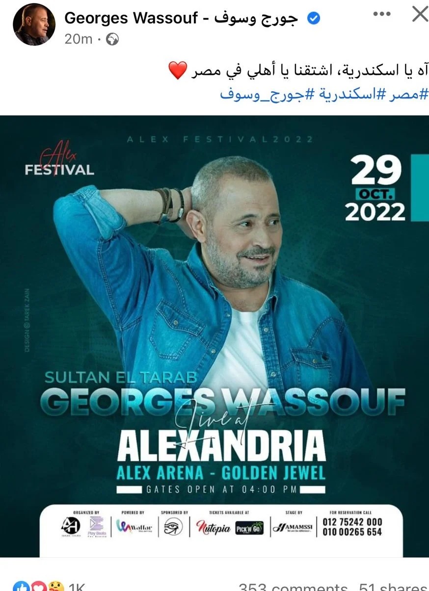 وروج جورج وسوف لـ حفله في الاسكندرية من خلال حسابه الرسمي بموقع التواصل الإجتماعي “فيسبوك”، اذ كتب: “اه يا إسكندرية.. اشتقنا يا أهل مصر"، لتنهال عليها التعليقات بتحمسهم واشتياقهم لهذا الحفل.