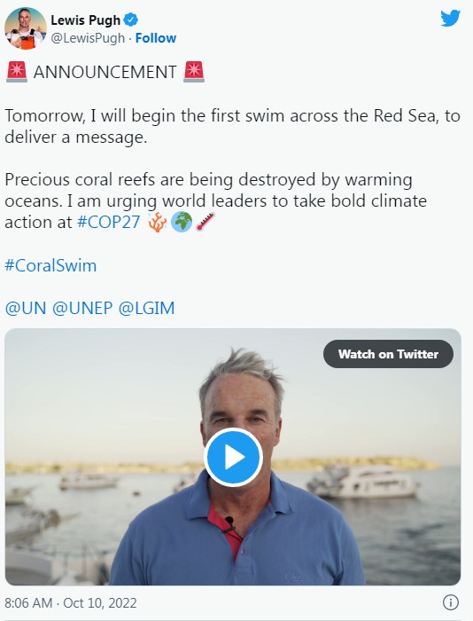 وأكد السباح البريطاني، خلال تغريدة له، أن رحلته هدفها جذب انتباه قادة العالم وصناع القرار تجاه تأثيرات تغير المناخ على الشعاب المرجانية.
