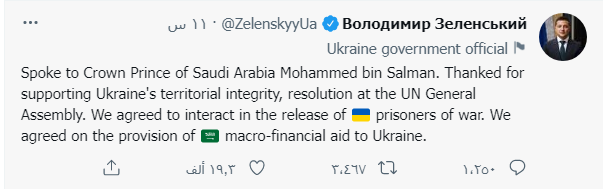 ومن ناحية أخرى، قال الرئيس الأوكراني فى تغريدة له عبر حسابه الرسمي على تويتر إنه تحدث مع ولى العهد السعودي، وشكره على دعم بلاده لوحدة الأراضي الأوكرانية خلال الأجتماع الأخير للجمعية العامة للأمم المتحدة.