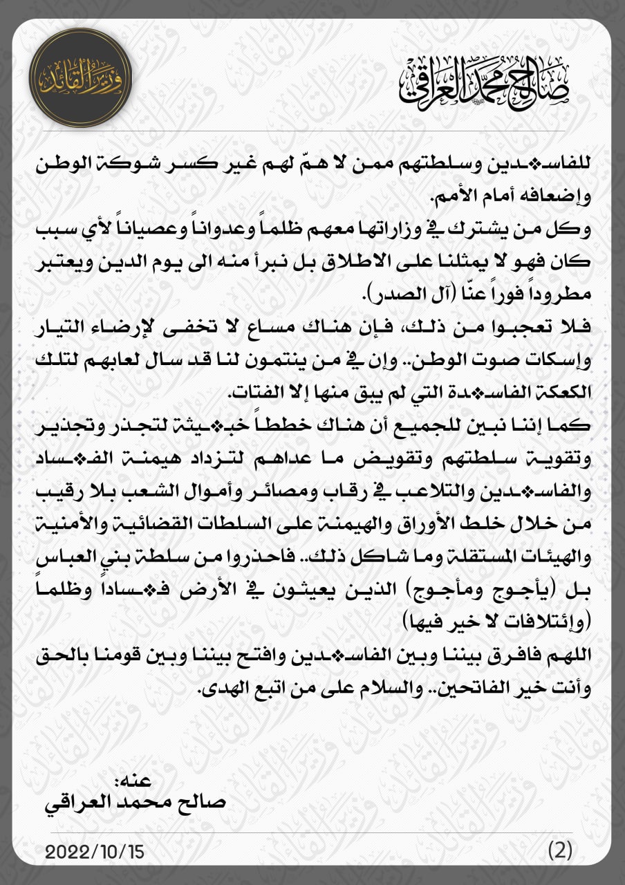 وقال صالح العراقى فى تغريدة نشرت عبر صفحته الرسمية على تويتر :" نؤكد على رفضنا القاطع والواضح والصريح للاشتراك أي من التابعين لنا فى هذه التشكيلة الحكومية التى يترأسها محمد شياع السوداني". وهو المدعوم من الإطار التنسيقى خصم التيار الصدري.