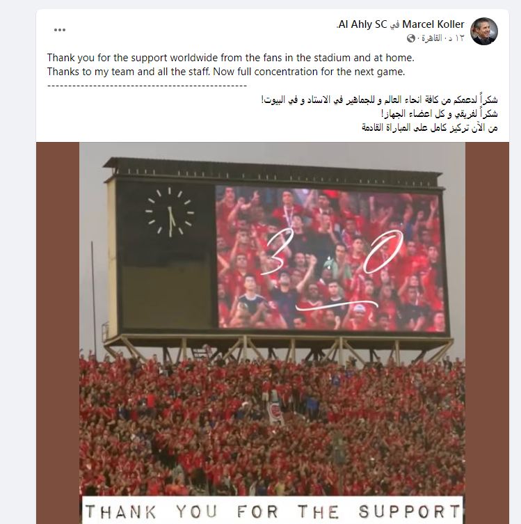 وكتب مارسيل كولر عبر صفحته الرسمية على موقع التواصل الإجتماعي “فيس بوك”: “شكراً لدعمكم من كافة انحاء العالم و للجماهير في الاستاد و في البيوت، شكراً لفريقي و كل اعضاء الجهاز، من الآن تركيز كامل على المباراة القادمة”.