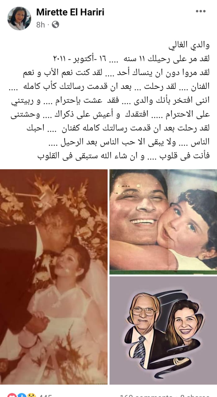 وتابعت: “لقد مروا دون ان ينساك أحد .. لقد كنت نعم الأب و نعم الفنان .. لقد رحلت .. بعد ان قدمت رسالتك كأب كامله .. اننى افتخر بأنك والدى .. فقد عشت بإحترام .. و ربيتني على الاحترام .. افتقدك و أعيش على ذكراك .. وحشتنى لقد رحلت بعد ان قدمت رسالتك كامله كفنان .. احبك الناس .. ولا يبقى الا حب الناس بعد الرحيل .. فأنت فى قلوب .. و ان شاء الله ستبقى فى القلوب”.
