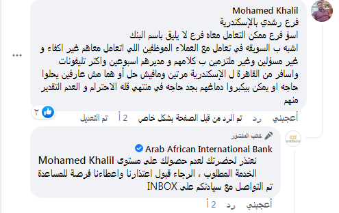 علق أحد عملاء البنك العربى الافريقى عبر صفحة المصرف على موقع "فيسبوك"، قائلاً: "فرع رشدي بالإسكندرية أسوأ فرع ممكن التعامل معاه فرع لا يليق باسم البنك".