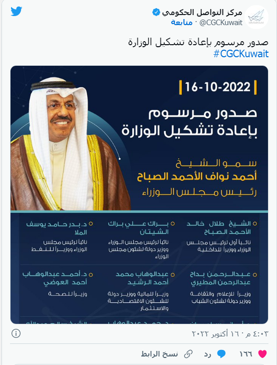 ويذكر أن فى وقت سابق من أكتوبر الجاري، أصدر ولى العهد الشيخ مشعل الأحمد أمر أميرى بإعادة تعيين الشيخ أحمد نواف الأحمد الصباح رئيسا لمجلس الوزراء وتكليفه بترشيحه أسماء الحكومة الجديدة.