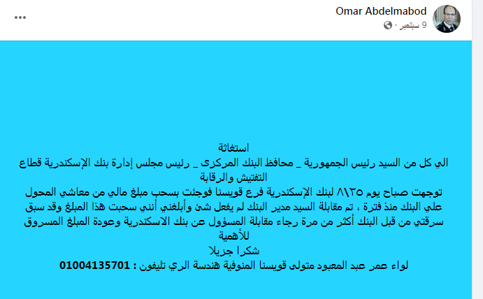 نشر أحد عملاء بنك الاسكندرية عبر صفحته الشخصية على موقع "فيسبوك"،: "استغاثة الي كل من السيد رئيس الجمهورية محافظ البنك المركزى رئيس مجلس إدارة بنك الاسكندرية قطاع التفتيش والرقابة".