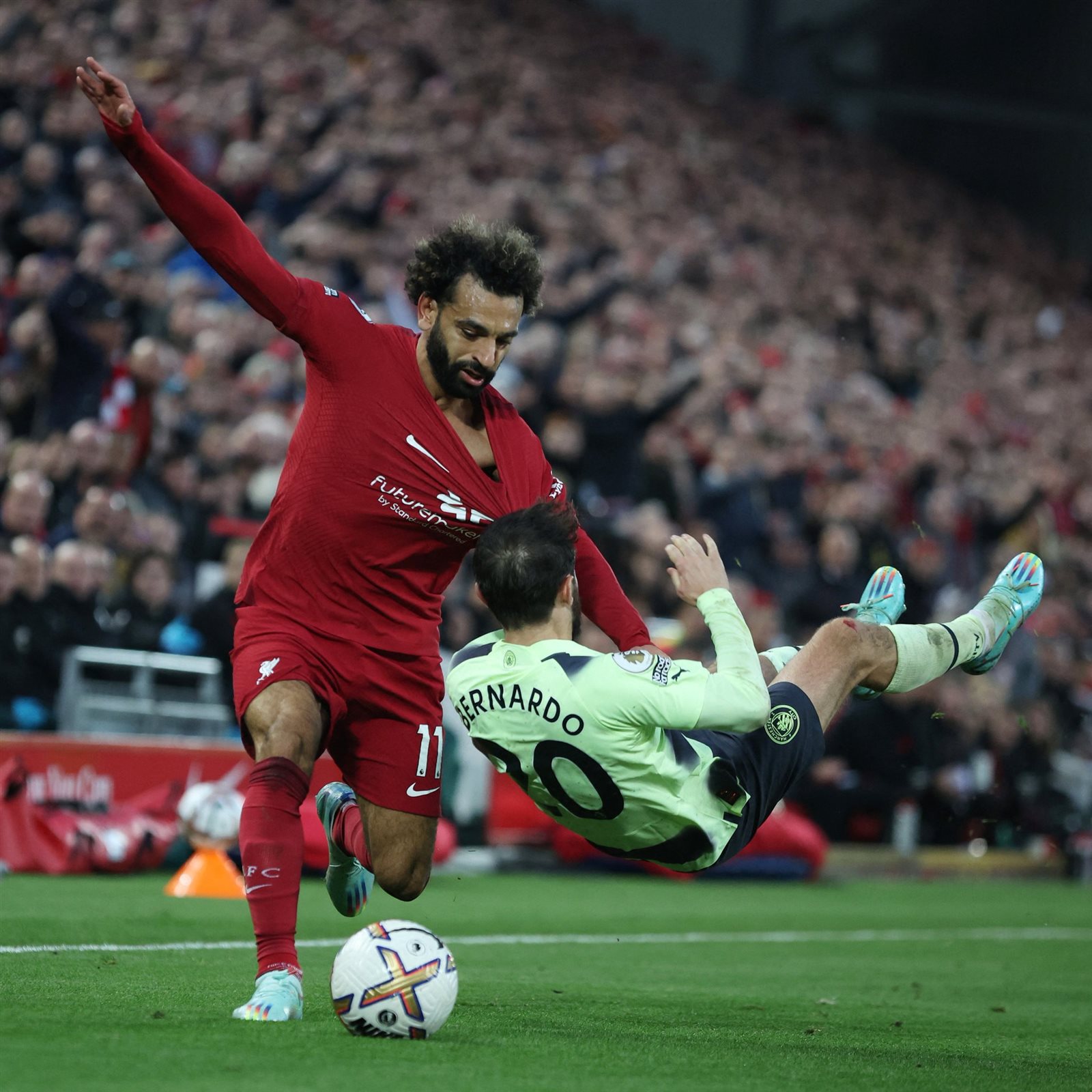 جاء تصرف البرتغالي برناردو سيلفا نجم فريق مانشستر سيتي، مع محمد صلاح بسبب ما فعله الفرعون المصري معه من قبل خلال لقاء الدور الأول بين الفريقين في الموسم الماضي، بعدما قام صلاح بمراوغته ليسقط على الأرض ويصبح حديث الصحافة العالمية ويتصدر أغلفة الصحف الإنجليزية ويحصد محمد صلاح أفضل هدف في الموسم .