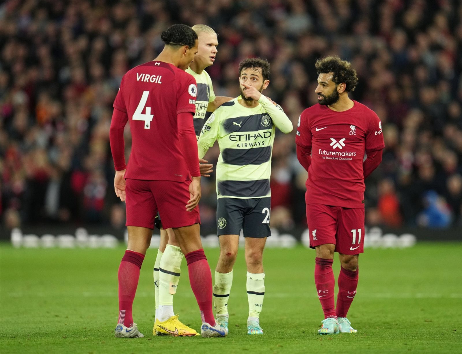 وبعد تلك المشادة لم يحتسب حكم اللقاء، أي مخالفة على فريق مانشستر سيتي، الأمر الذي أساء غضب الألماني يورجن كلوب المدير الفني لفريق ليفربول، ليعترض بشدة على حكم اللقاء ويطرد من المباراة بسبب الاعتراض، ليقوم من بعدها برناردو سيلفا بتوجيه عبارات سيئة لمحمد صلاح ثم تدخل هالاند وفان دايك من أجل السيطرة على الموقف كما موضح في الصورة التالية.