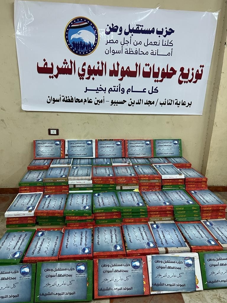 كما تواصل أمانة مركز إدفو، توزيع عدداً من عبوات حلوي المولد النبوي الشريف، علي المرضي والعاملين بوحدات الغسيل الكلوي بمستشفى السباعية ومدينة الرديسية، بمناسبة المولد النبوي الشريف، مقدمين خلالها التهانى للمرضى والعاملين بمناسبة ذكرى المولد النبوي الشريف.