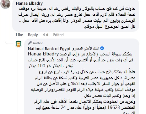 علقت إحدى البنك الاهلى المصرى عبر صفحة المصرف الرسمية على موقع "فيسبوك"، قائلة: "حاولت قبل كده فتح حساب بالدولار والبنك رفض رغم إني عايشة بره موظف خدمة العملاء قالي لازم إقامة عمل خارج مصر رغم إني وريته إيصال صرف الويسترن يونيون اللي بيثبت مصدر الدولار.. وأنا إقامتي بره مش إقامه عمل .. هل أصبح الموضوع أسهل الآن".