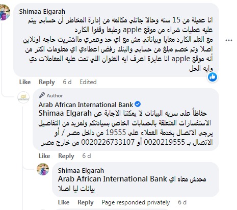 رد موظف خدمة عملاء البنك العربى الافريقى بالصفحة، قائلاً: "حفاظاً على سرية البيانات لا يمكننا الإجابة عن الاستفسارات المتعلقة بالحسابات الخاص بسيادتكم ولمزيد من التفاصيل".