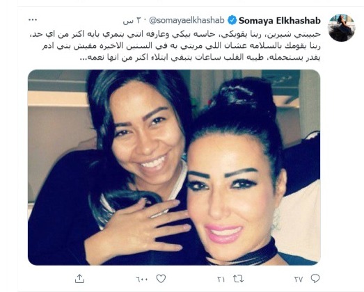 وكتبت سمية الخشاب عبر تويتر: حبيبتي شيرين، ربنا يقويكي، حاسه بيكي وعارفه انتي بتمري بايه اكتر من اي حد.