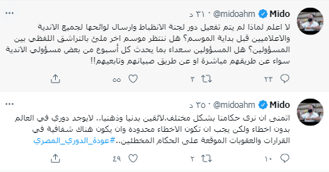 وكتب أحمد حسام :ميدو"، عبر تويتر:" صباح الخير على الجميع النهاردة عودة الدوري المصري موسم استعد له الجميع بشكل جيد كنت اتمنى أن يعقد كليتنرج مؤتمرا صحفيا يعلن فيه عن تعليماته للحكام والقرارات الموحدة للحكام حتى يعلمها الجمهور والاعلام قبل بداية الموسمكنت اتمنى ان يكون هناك اجتماع بين كلاتينبرغ والمخرجين!!.
