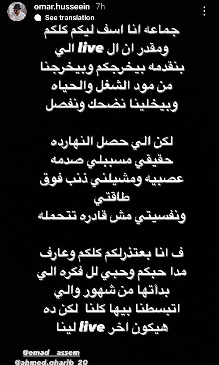 بعدها بـ سعات خرج عمر حسين ليعلن بأن ذلك البث سيكون أخر واحد له في المسيرة التي بدأها منذ شهور، اذ قال في ستوري عبر موقع تبادل الصور والفيديوهات انستجرام: "“أنا أسف ليكم كلكم، اللي حصل النهاردة مسببلي صدمة عصبية ومشيلتي ذنب فوق طاقتي ونفسيتي مش قادرة تتحمله، بعتذرلكم كلكم وعارف مدى حبكم وحبي للفكرة، لكن ده هيكون أخر لايف ليا”.