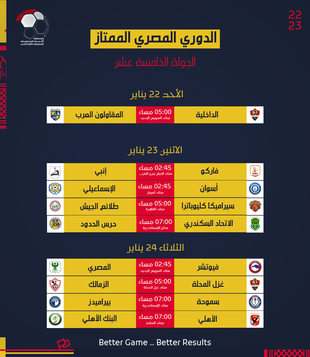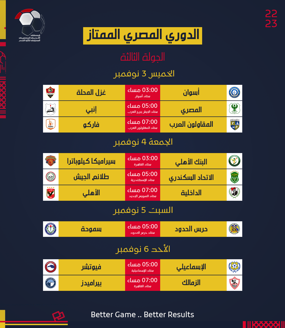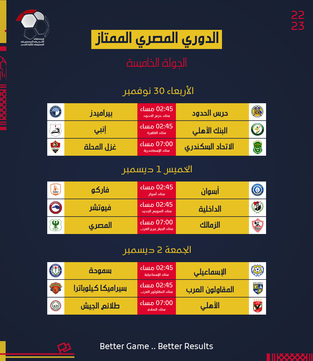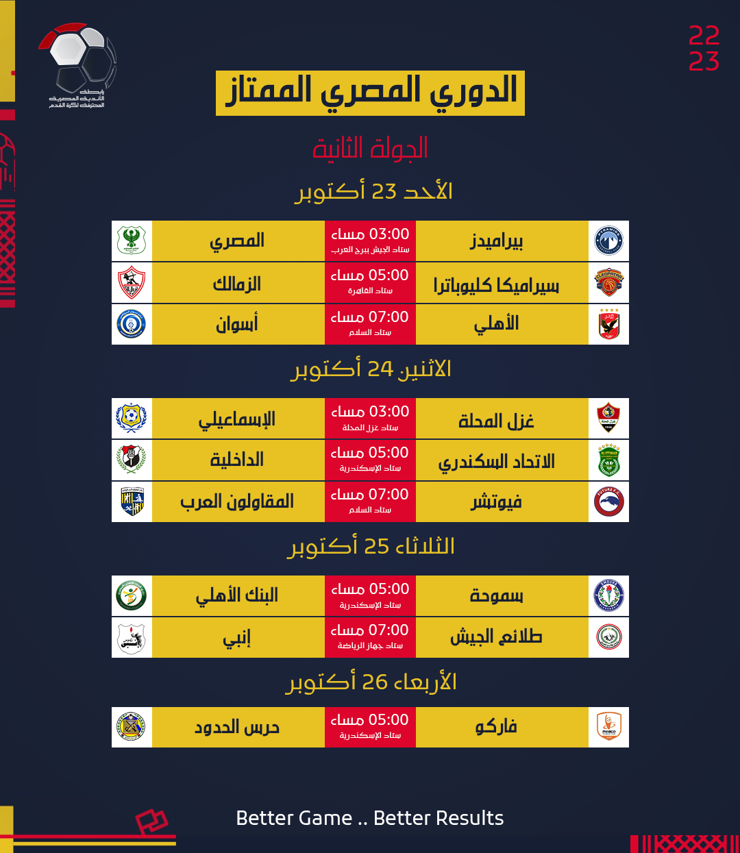 أعلنت رابطة الأندية المصرية المحترفة لكرة القدم، جدول مواعيد مباريات الدور الأول والثاني من مسابقة الدوري للموسم الجديد 2022/ 2023.